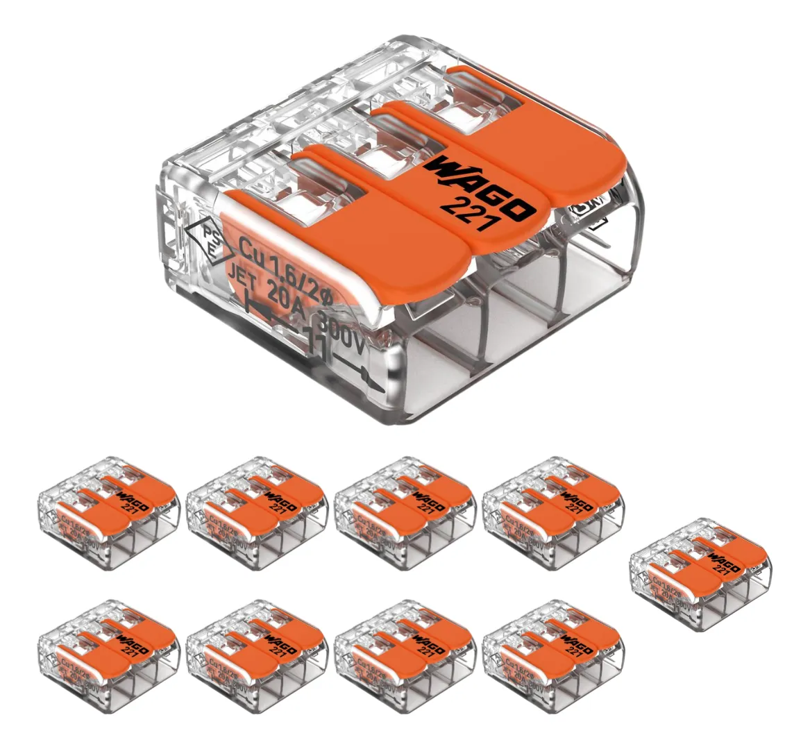 Kit 10 Conectores WAGO 221-413 (3 vias) 32A até 4mm², conexão rápida com alavanca, ideal para emendas e manutenção elétrica.